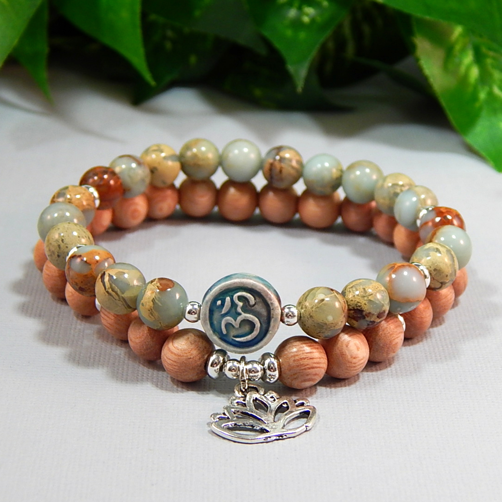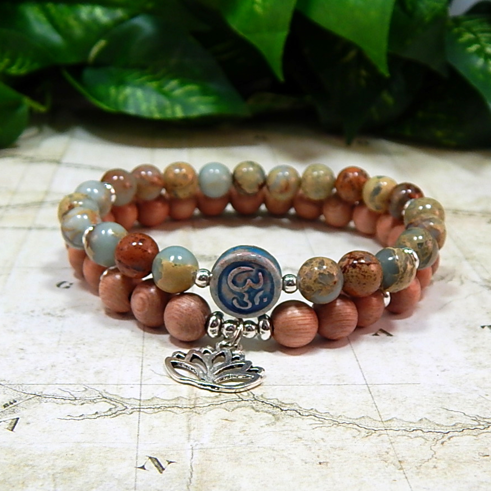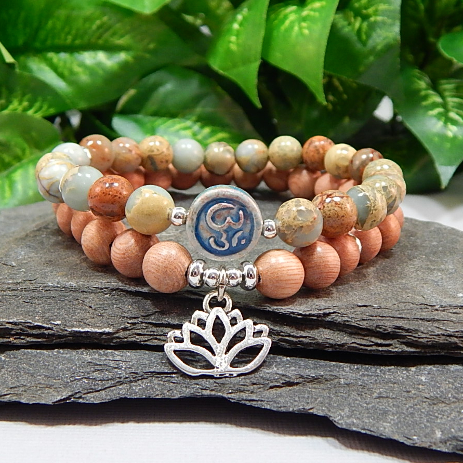 This 7in (17.78cm) handmade bracelet set feels like carrying a piece of the earth’s calm rhythm with you. The soothing patterns of Impression Jasper are known for tranquility, nurturing energy, and grounding balance, while the warm Rosewood beads add a touch of natural serenity and sacred mindfulness. Finished with a unique Raku Om bead, these stacking stretch bracelets slip on effortlessly and become your everyday reminder to stay centered, embrace harmony, and let your quiet magic flow with ease. 8mm Impression Jasper and Rosewood beads with a 10mm Raku Ohm focal bead, accented with silver spacer beads and a silver Lotus Flower charm.