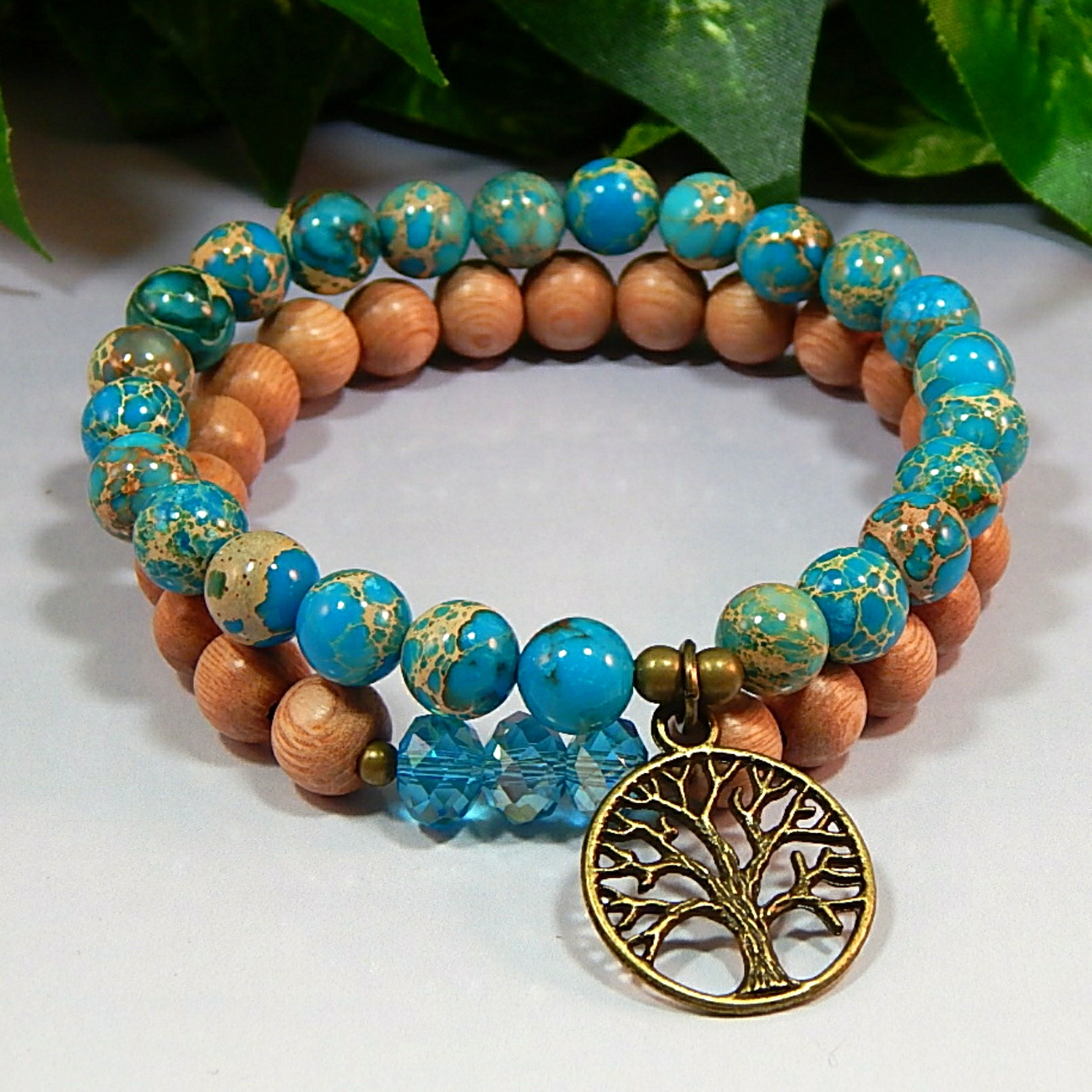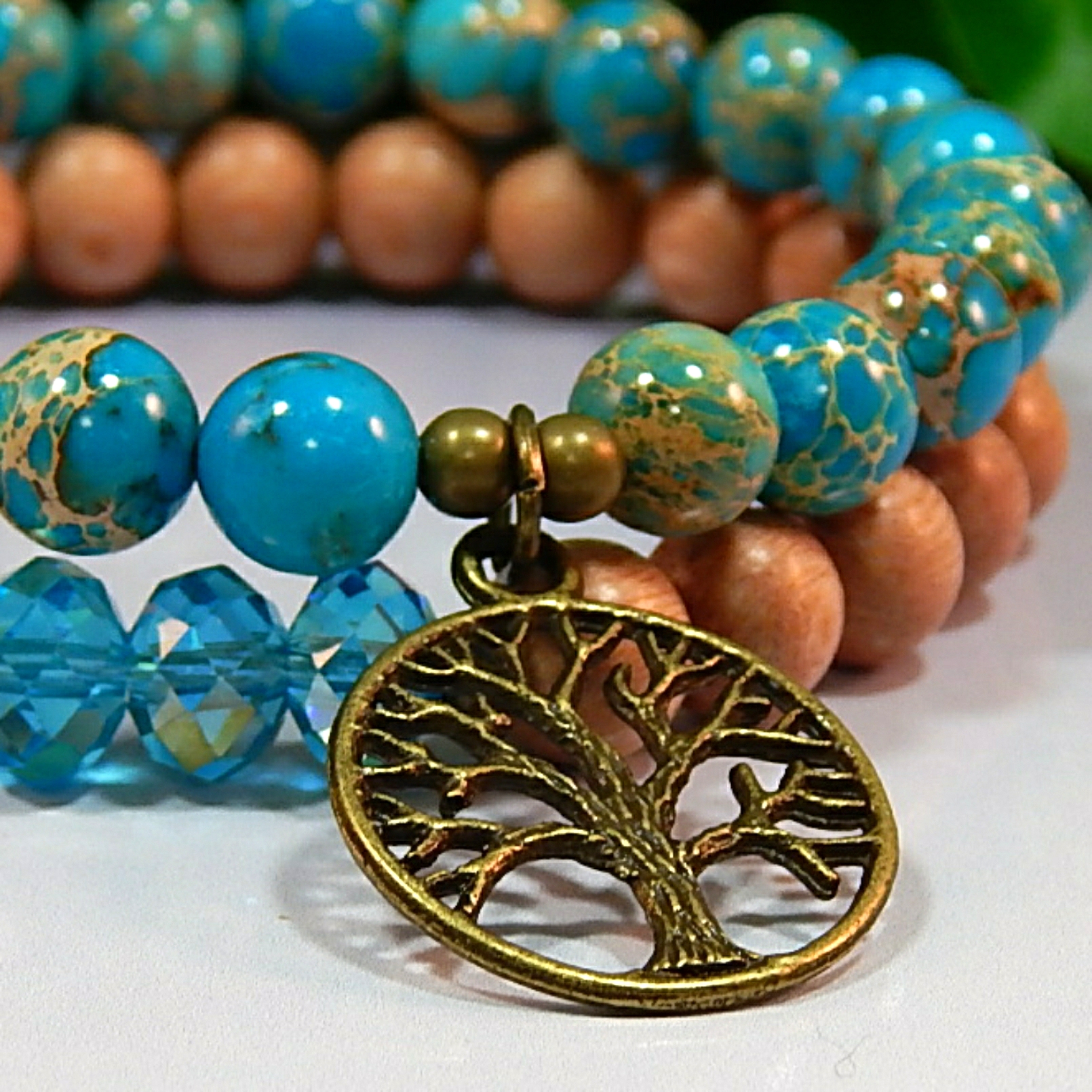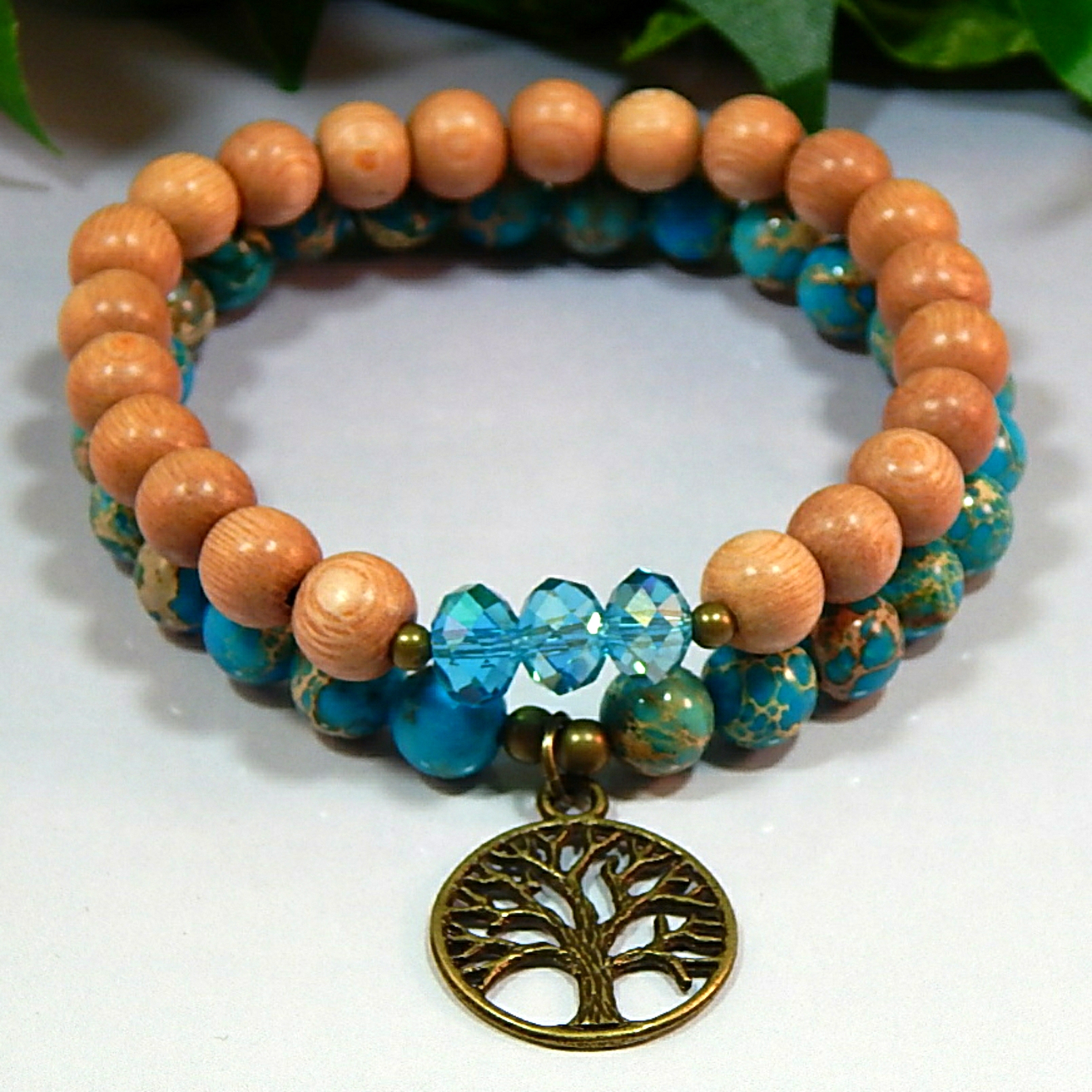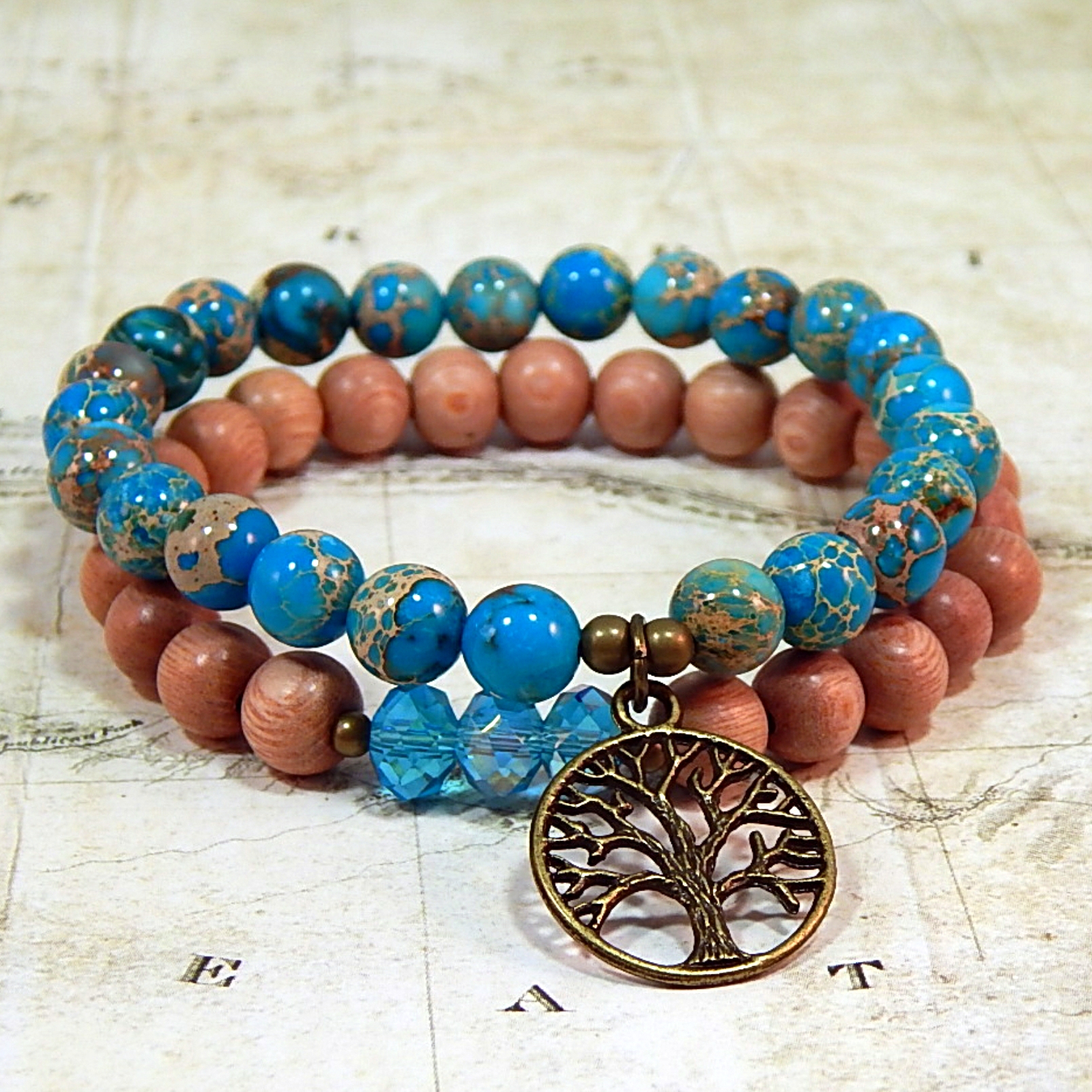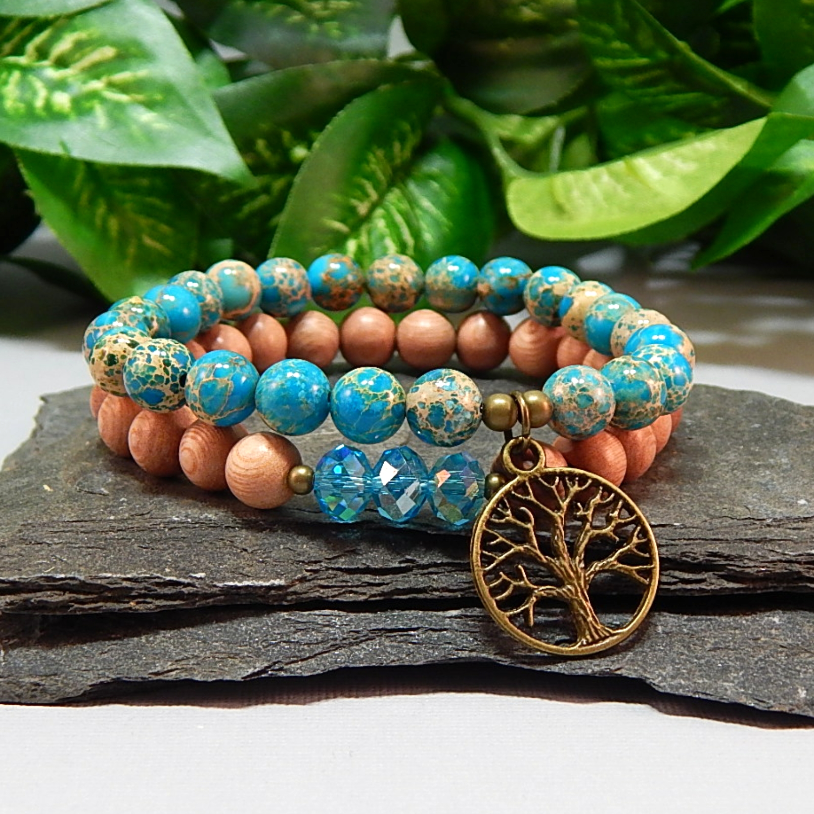 Turquoise Impression Jasper & Rosewood Bracelet with Tree of Life – Peace, Growth & Natural Balance