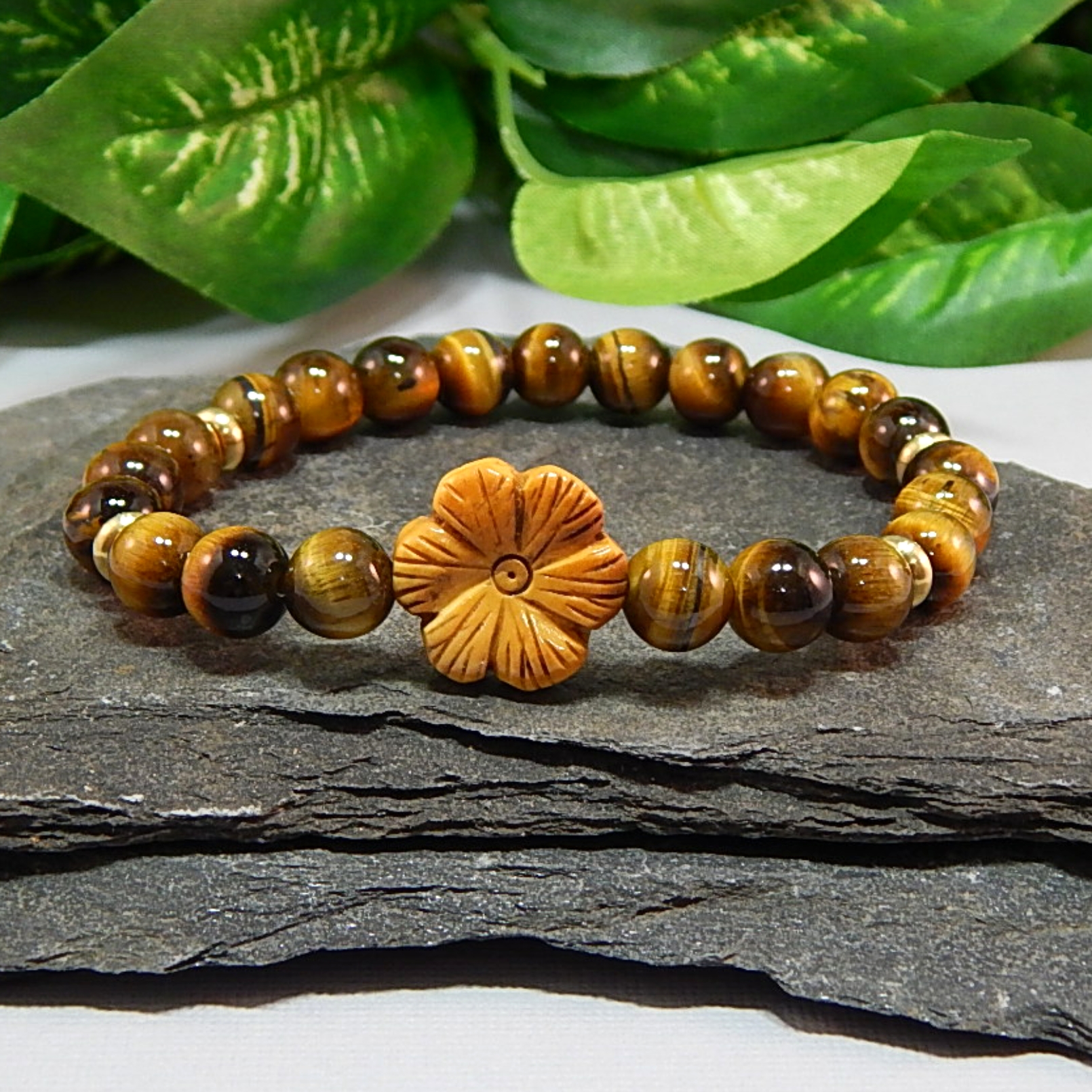 This bracelet blends the golden shimmer of Tiger Eye with a delicately carved flower bead, creating a talisman of courage, protection, and timeless beauty. Tiger Eye is revered for its ability to ground energy and awaken confidence, while the floral carving adds a touch of natural grace and mystical symbolism. Designed in a comfortable stretch style, it rests gently on your wrist as a reminder of resilience, harmony, and the quiet strength that blooms within.