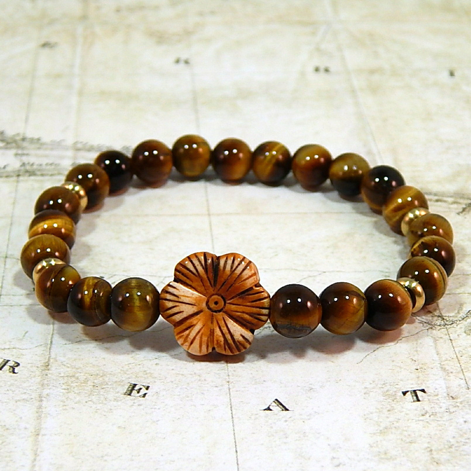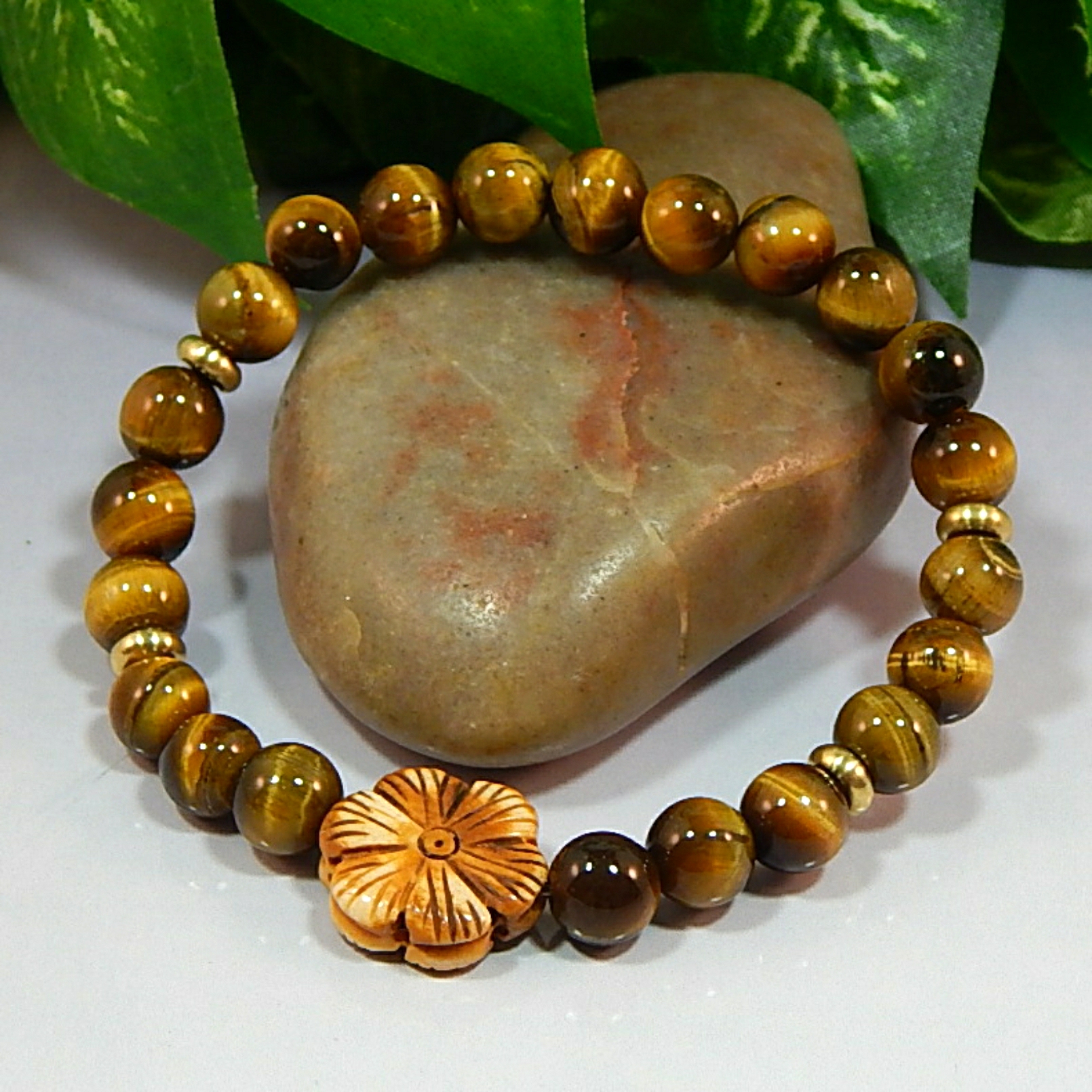 Carved Flower & Tiger Eye Gemstone Bracelet – Courage, Protection & Mystical Elegance