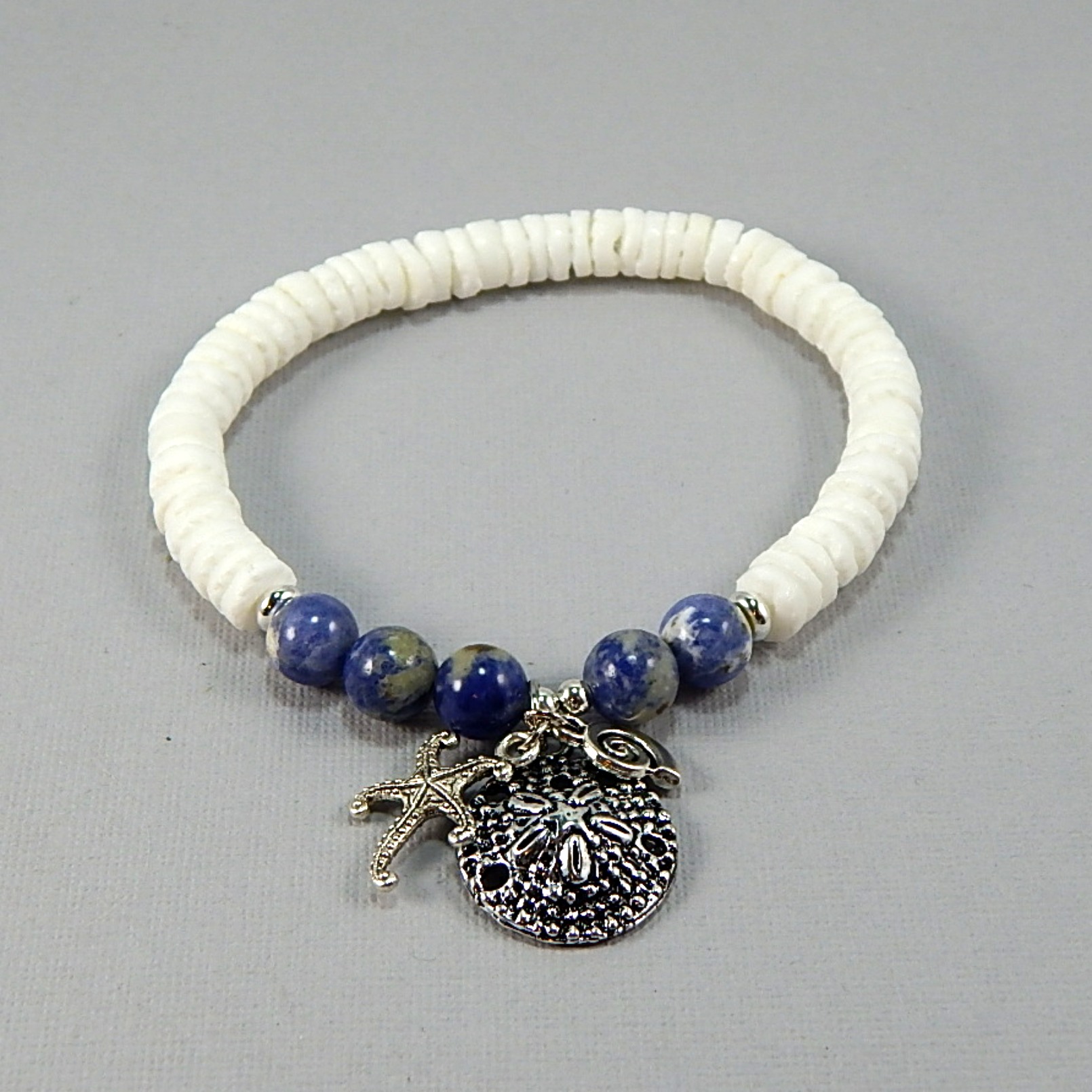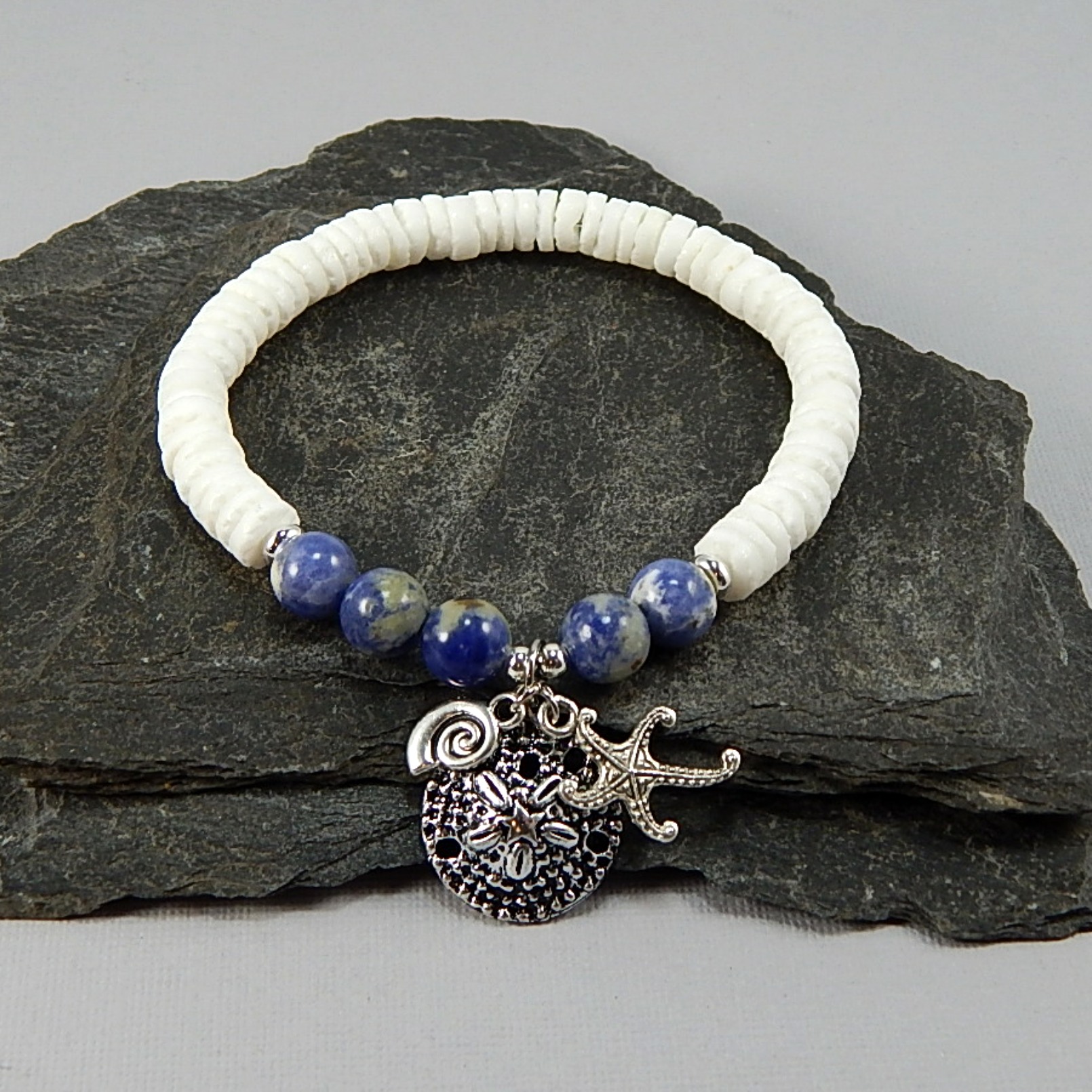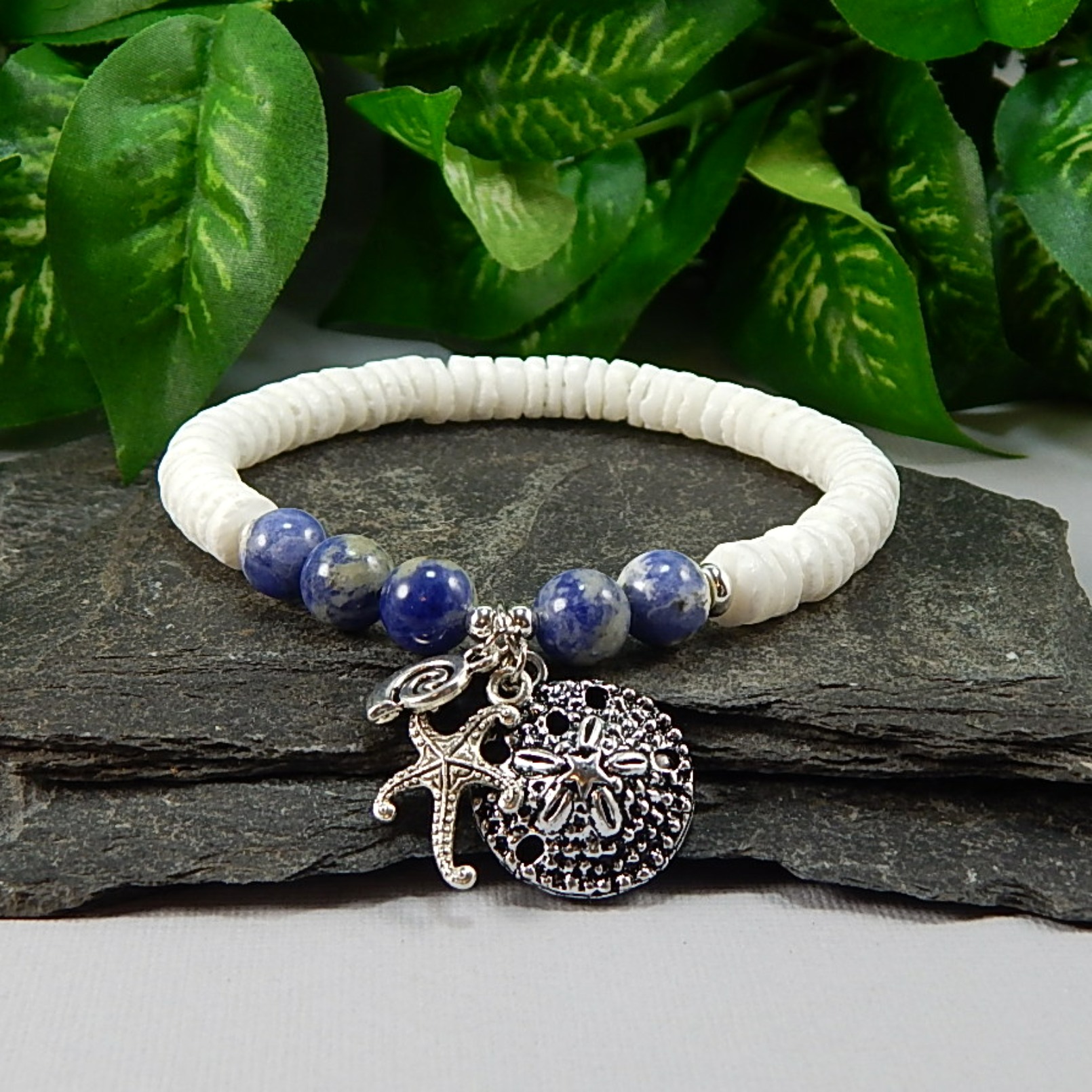 Sodalite & Puka Shell Bracelet with Beach Charms – Ocean Calm, Intuition & Coastal Spirit
