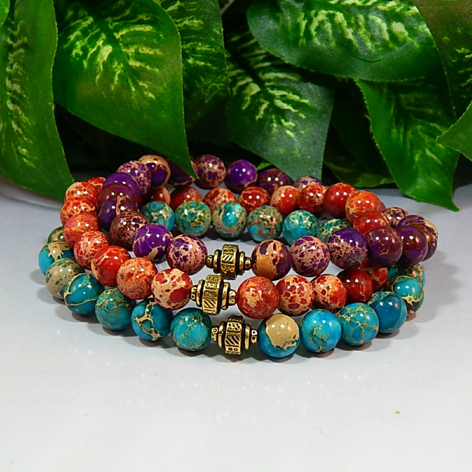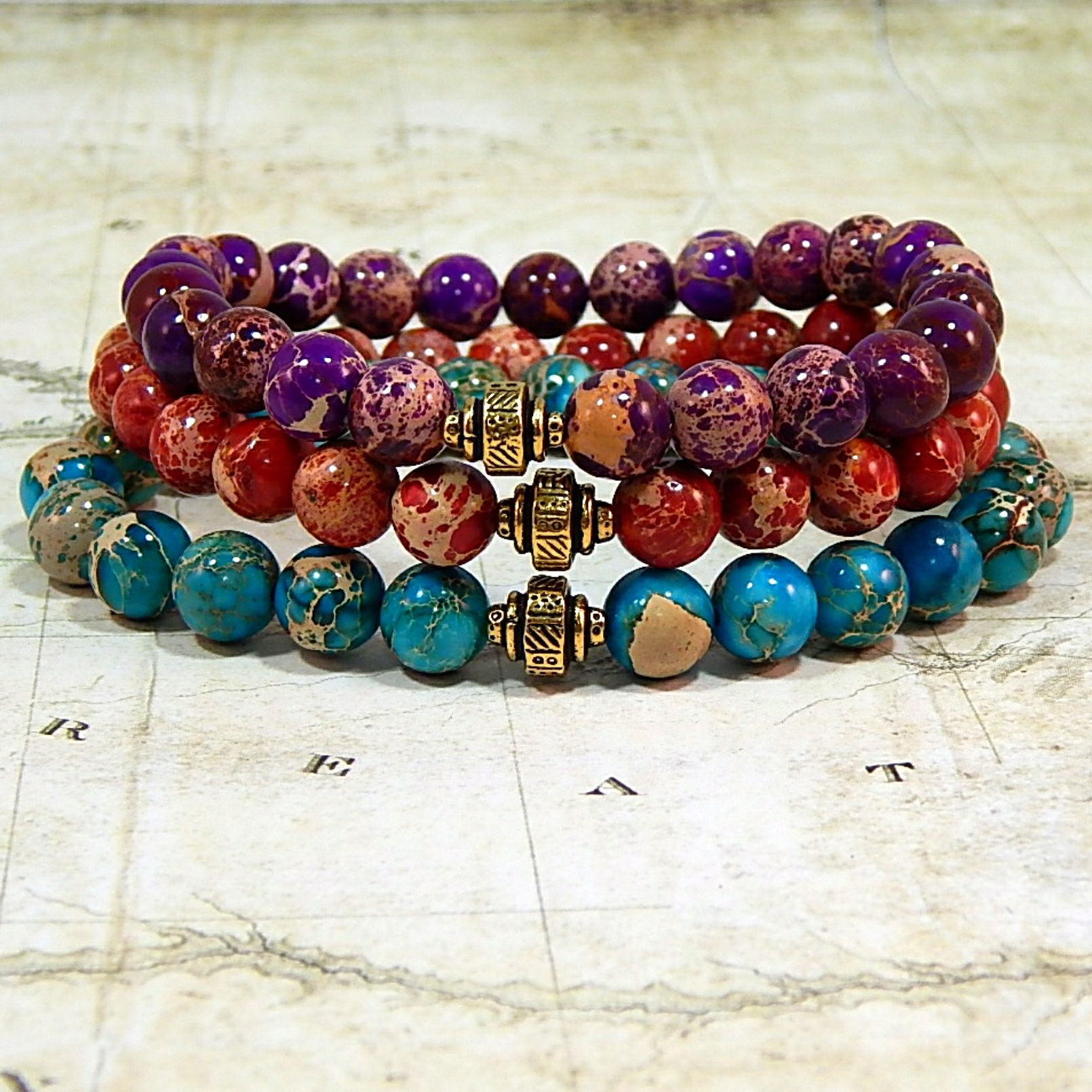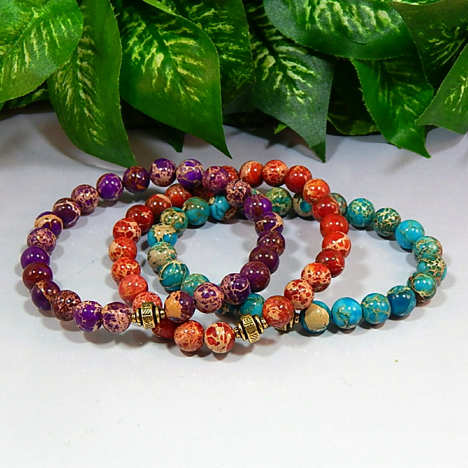 This trio of handmade Impression Jasper stretch bracelets brings together purple, red, and turquoise beads accented with antique gold focal charms for a look that is both striking and meaningful. Known as Aqua Terra or Sea Sediment Jasper, this stone is celebrated for its protective energy, balancing yin and yang, and aligning the chakras while offering a stabilizing, healing presence. Legends speak of Jasper as a guardian stone, driving away negativity and connecting the wearer to the grounding forces of nature. Each bracelet is crafted with care on durable stretch cord, making them perfect for meditation, yoga practice, or simply adding a touch of spiritual elegance to your everyday style. Whether worn together as a powerful set or individually for subtle beauty, these bracelets embody harmony, protection, and timeless handmade artistry.