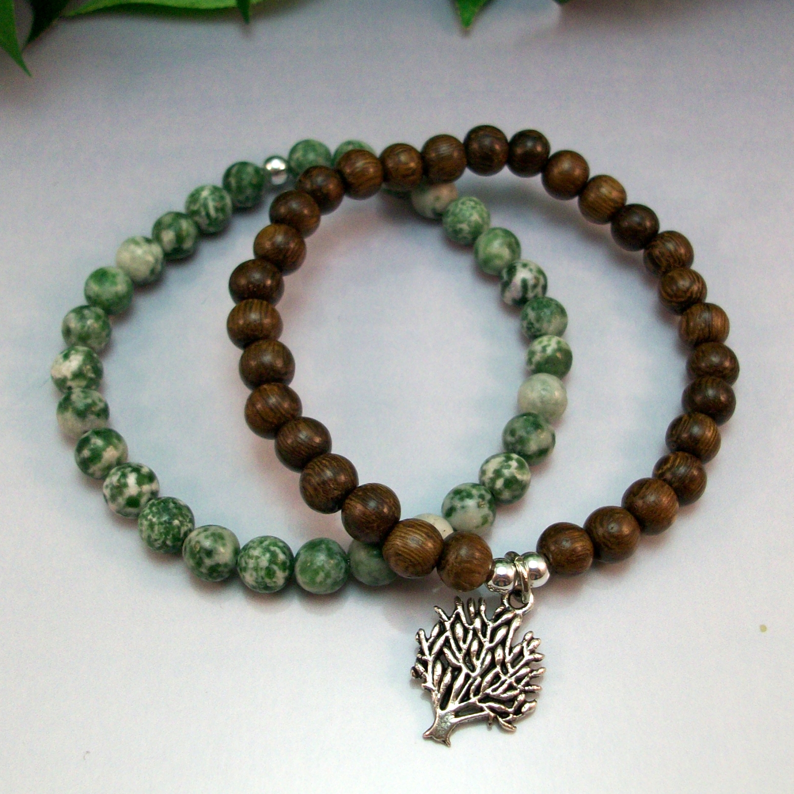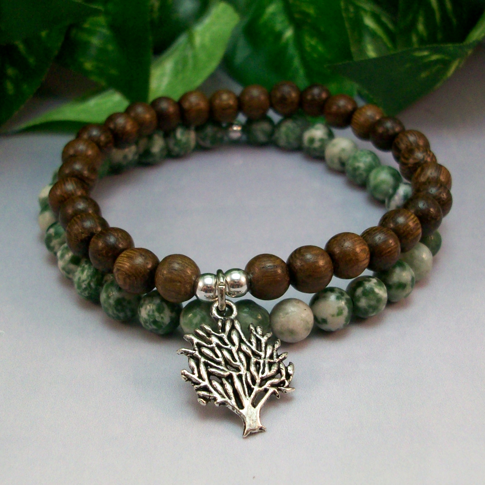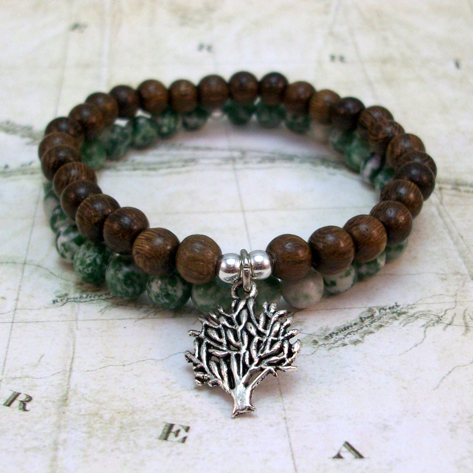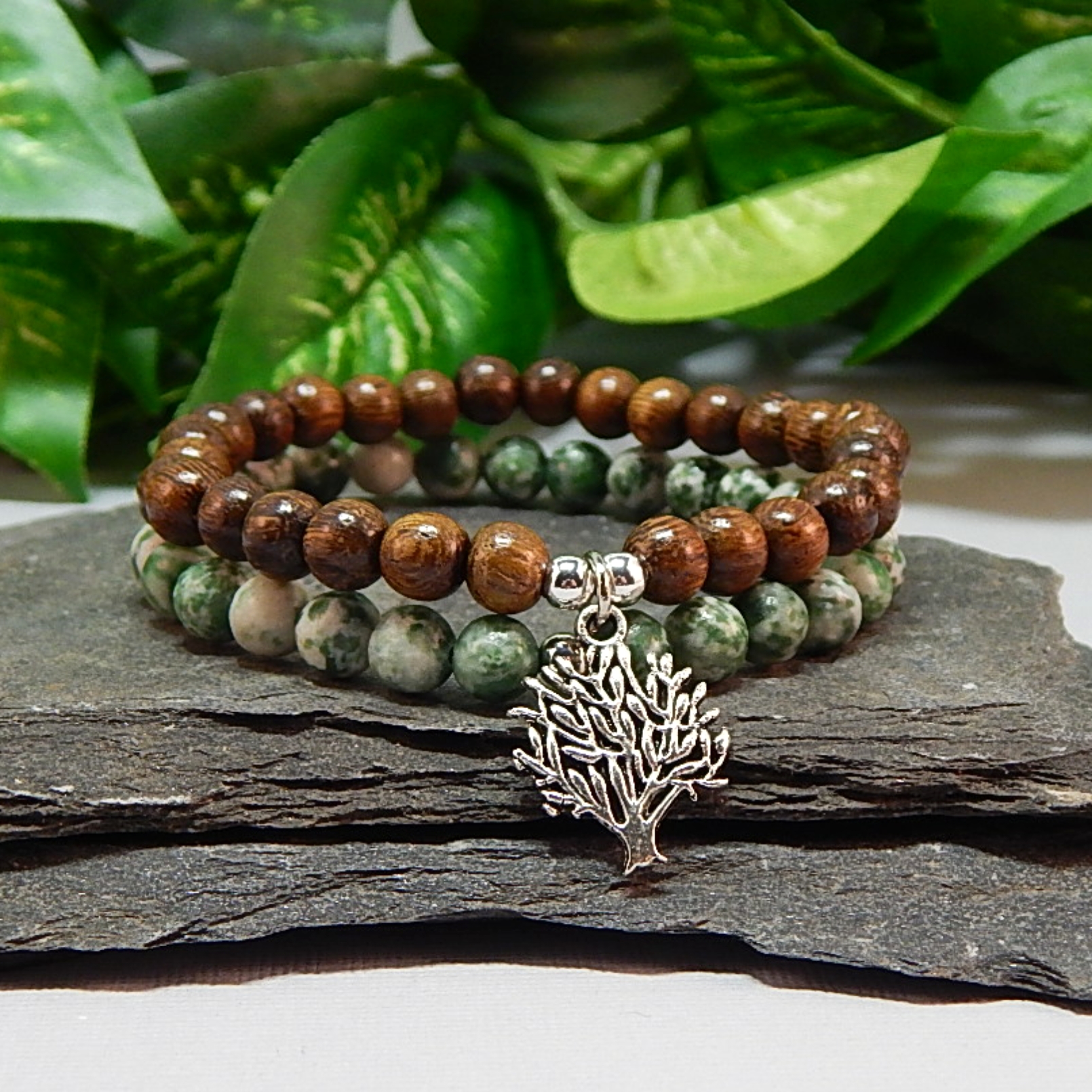 Tree Agate & Wood Gemstone Bracelet with Tree Charm – Growth, Grounding & Natural Harmony