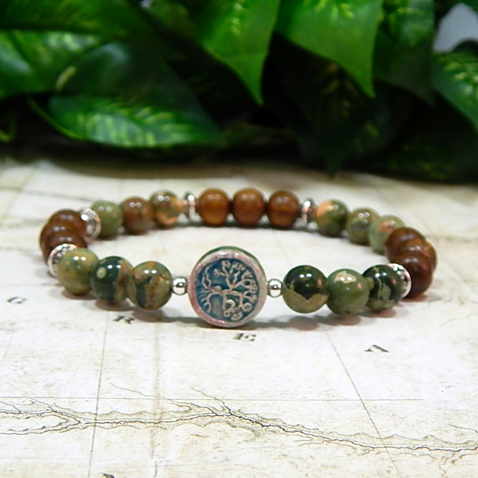 Rhyolite Gemstone & Robles Wood Bracelet with Raku Tree of Life – Harmony & Renewal