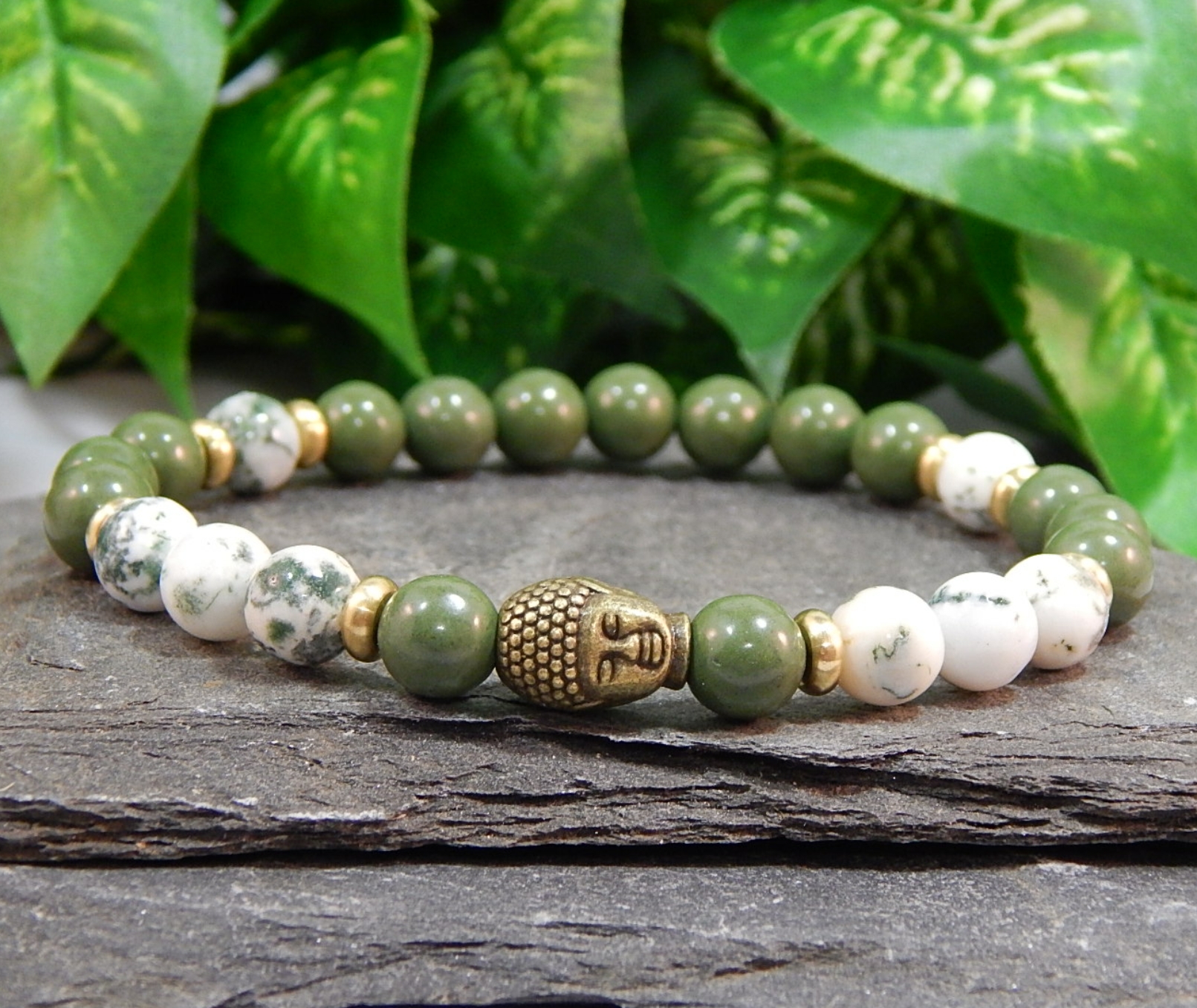 Tree Agate & Green Serpentine Men’s Bracelet with Brass Buddha – Harmony, Protection & Inner Peace