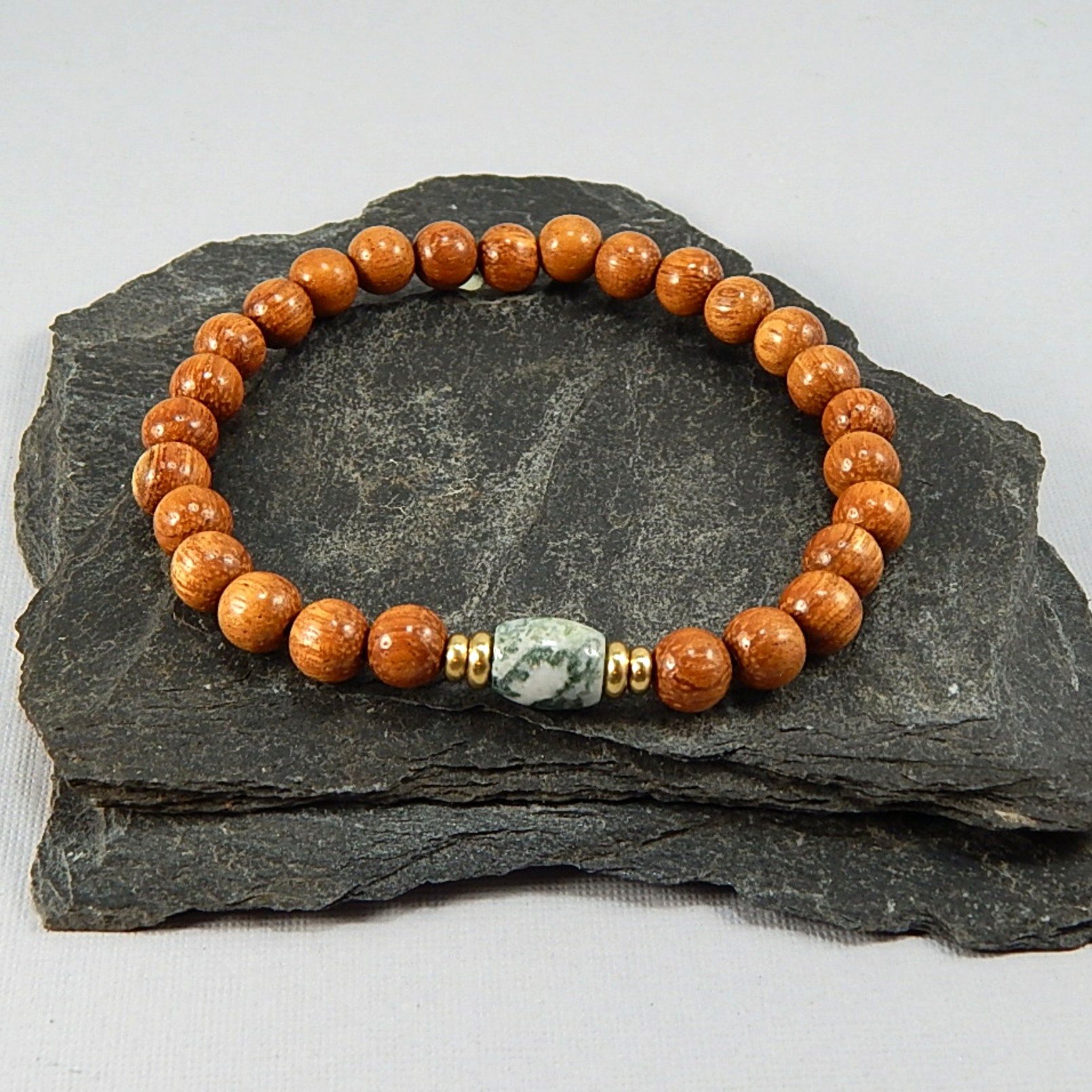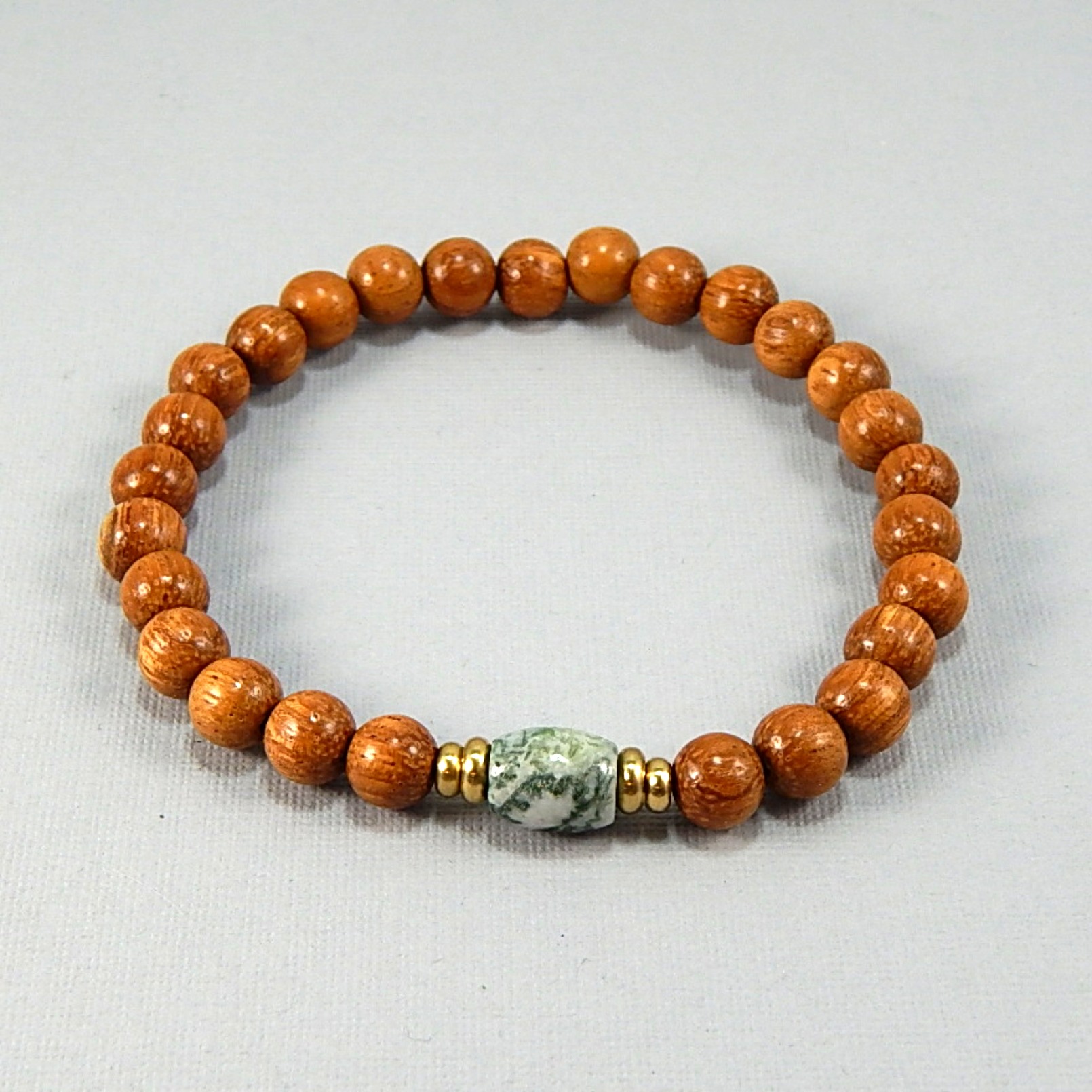 This bracelet feels like carrying the calm strength of the forest with you. The rich, earthy tones of Bayong Wood bring warmth, resilience, and a connection to nature, while the soothing greens of Tree Agate are known for grounding energy, nurturing harmony, and restoring balance. Together they create a timeless piece that slips on effortlessly and becomes your everyday reminder to stay centered and embrace peace. 8mm Baying wood beads with a Tree Agate focal and Brass accents.