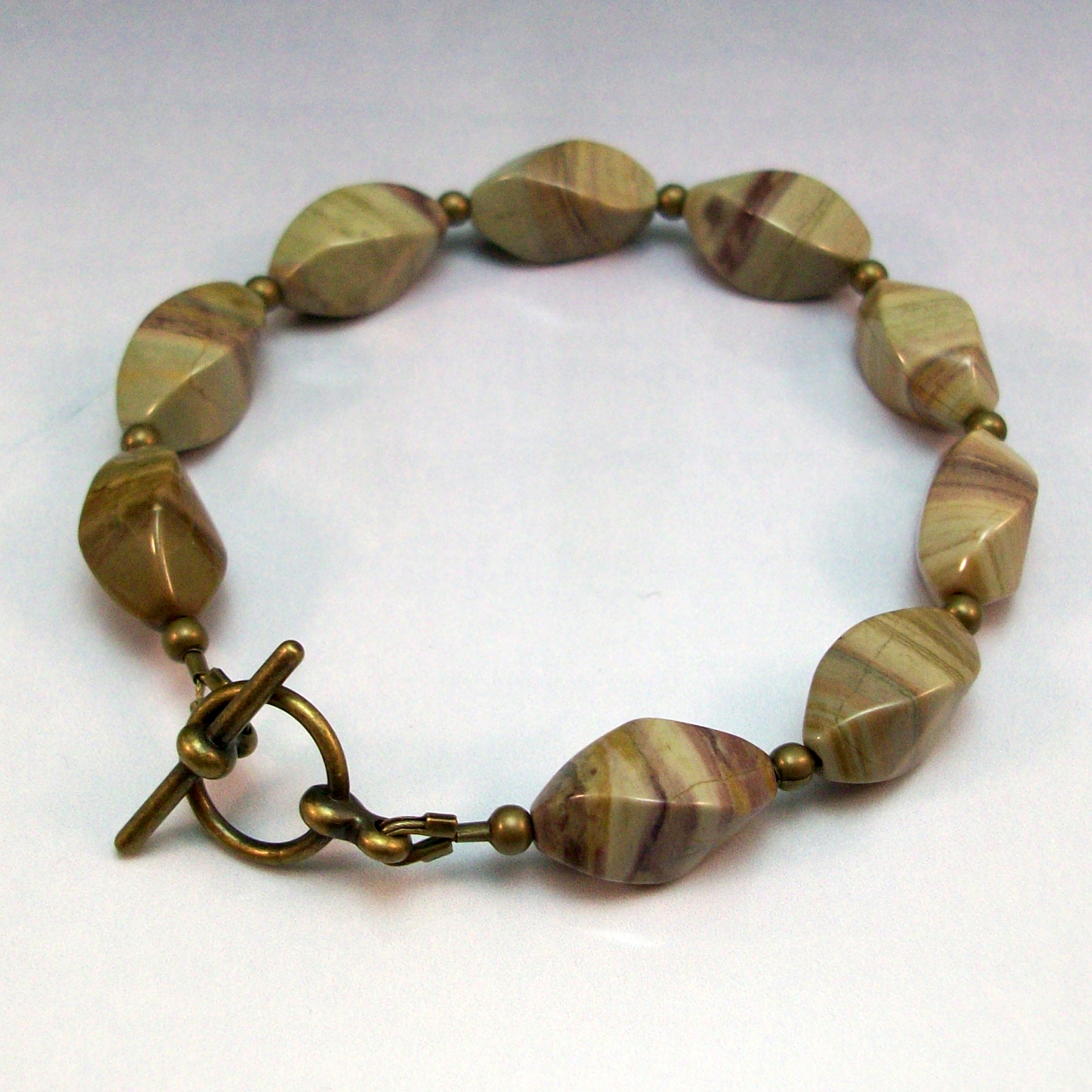 This 7in handmade bracelet feels like wearing a little piece of art from the earth, with porcelain jasper beads shaped into twisted ovals that glow in soft, earthy tones against warm brass accents. Known as a stone of creativity and balance, jasper is said to steady emotions and spark inspiration, making this piece more than just jewelry—it’s a soulful companion for everyday wear. Each bead is strung with care, creating a bracelet that feels timeless, natural, and effortlessly stylish, like carrying a touch of grounding magic on your wrist. 16x8mm Porcelain Jasper beads accented with 3mm Antique Brass round beads. It is finished with a simple antique brass toggle clasp.