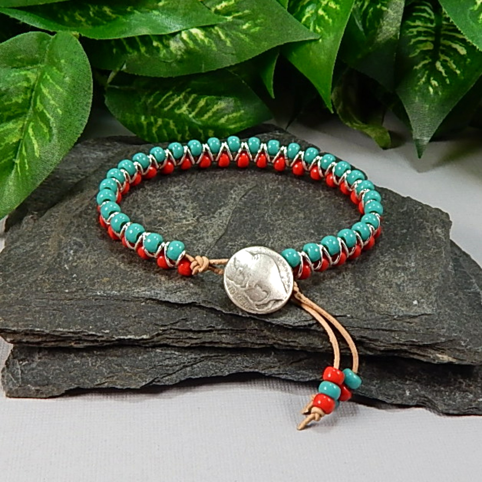 This 7in bracelet feels like a burst of wild spirit, blending vibrant turquoise and fiery red beads with the grounding strength of a Silver Buffalo Nickel. Handmade with care, it carries the energy of courage, protection, and connection to the earth, while the hook design makes it easy to wear every day. Whether you stack it with other treasures or let it shine solo, this goddess bracelet is your daily reminder to walk boldly and embrace your inner power. 6o Turquoise and Red seed beads strung on 1mm Natural leather. The silver shank button has a Buffalo Nickel depiction on it.