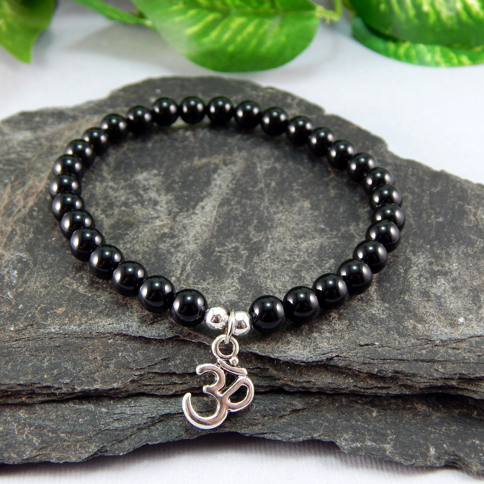 This bracelet is a sacred fusion of polished Black Agate beads and a silver Om charm, designed to channel focus, discipline, and inner strength. Its stretch design flows effortlessly with your movement, making it the perfect companion for yoga, meditation, or daily wear. Black Agate is revered for calming the spirit, sharpening attention, and guiding you toward self‑mastery, while its deep, grounding energy helps transform habits and awaken intuition. Slip it on and let its quiet power remind you of balance, resilience, and the harmony between body and soul. 6mm Black Agate beads accented with silver spacer beads and a 12x7mm silver Om Charm.
