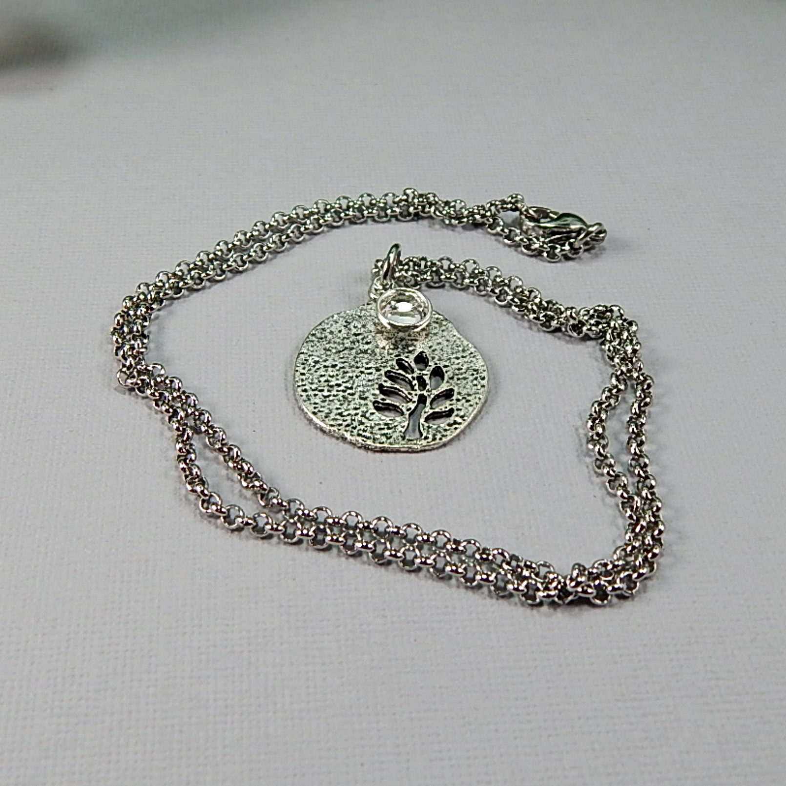 April Birthstone Leaf Pendant Necklace - Handmade Silver Leaf Cutout with Diamond Crystal Charm