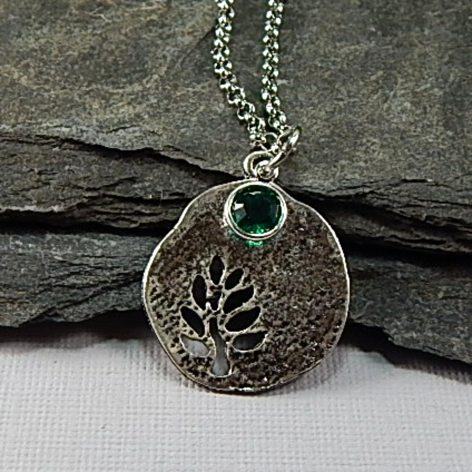 Celebrate birthday magic with this 18" handmade birthstone necklace, featuring a silver leaf cutout pendant adorned with a sparkling crystal charm in the dreamy Emerald hue for May. Suspended from a stainless steel rolo chain with a secure lobster clasp, it’s a timeless piece that feels both simple and soulful, perfect for adding a touch of personal charm to your daily style. The pendant is a 23mm (7/8in) antique silver abstract shape with a leaf cutout adorned with a 6mm crystal charm.