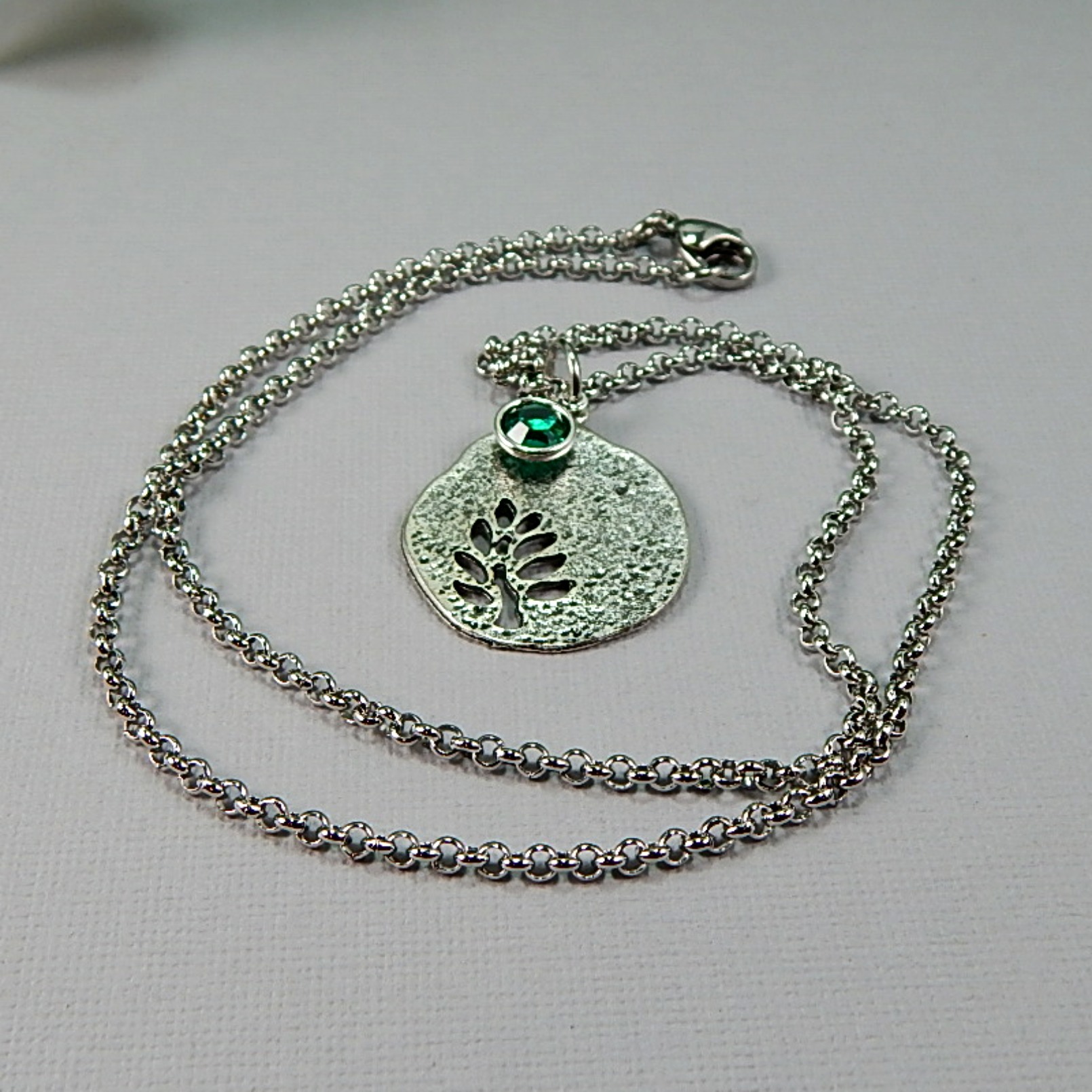 May Birthstone Leaf Pendant Necklace - Handmade Silver Leaf Cutout with Emerald Crystal Charm