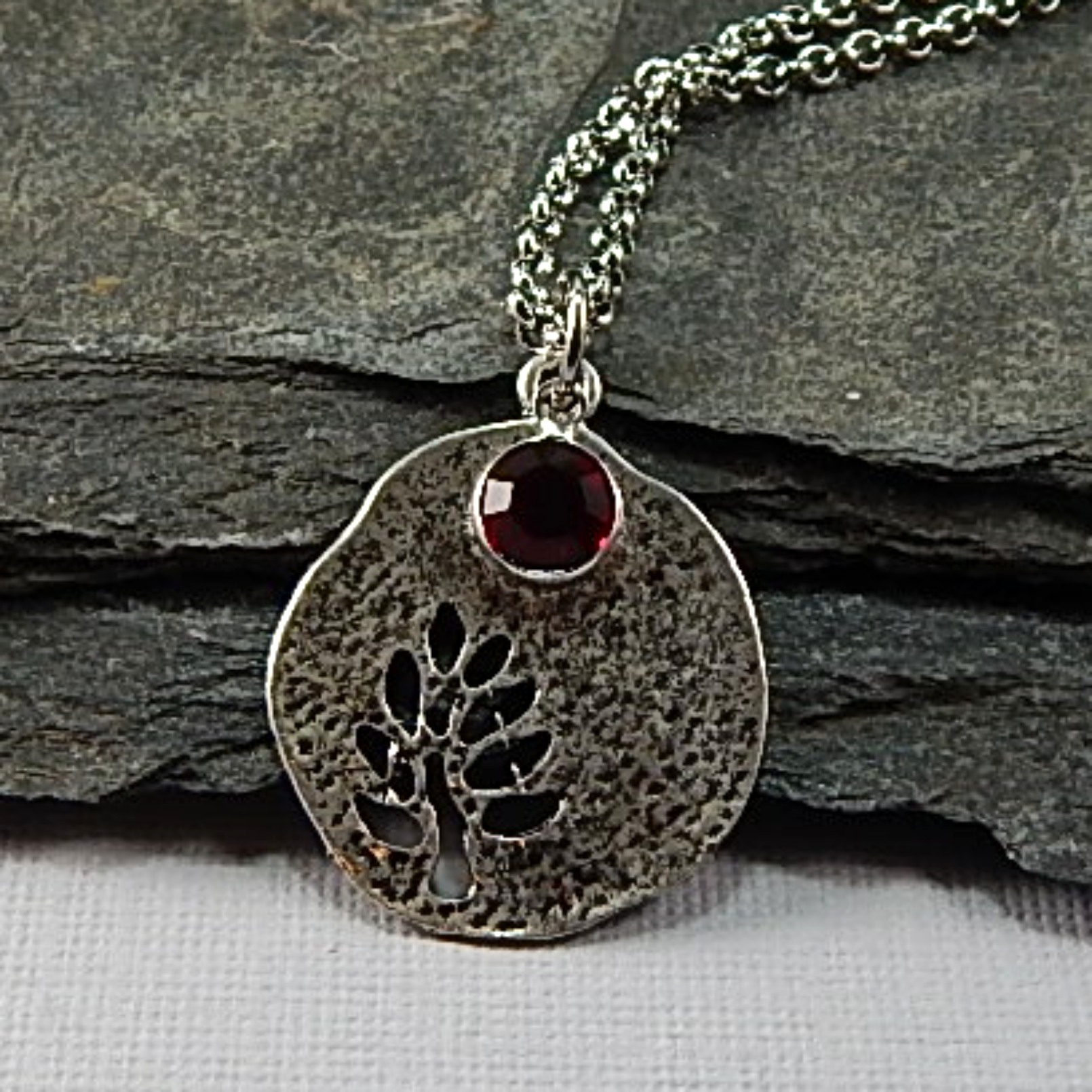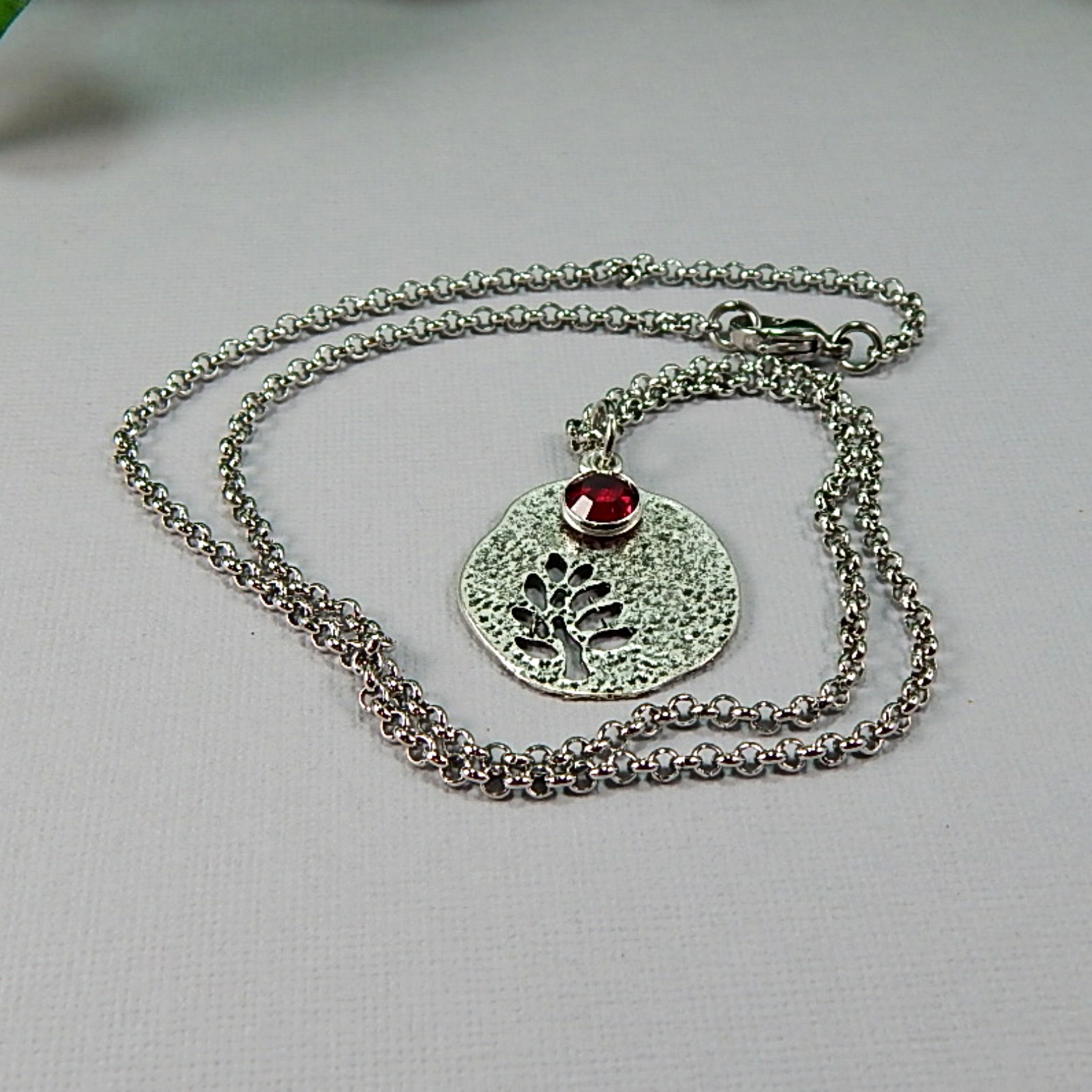 July Birthstone Leaf Pendant Necklace - Handmade Silver Leaf Cutout with Ruby Crystal Charm