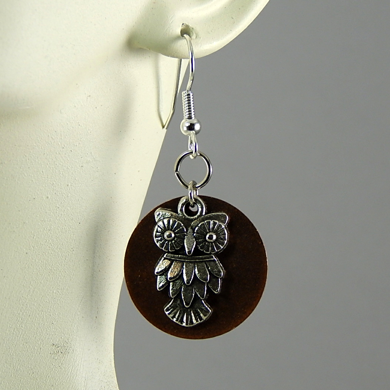 Full Moon Owl Earrings – Handmade Copper Disks with Silver Owl Charms on Hypoallergenic Ear Wires