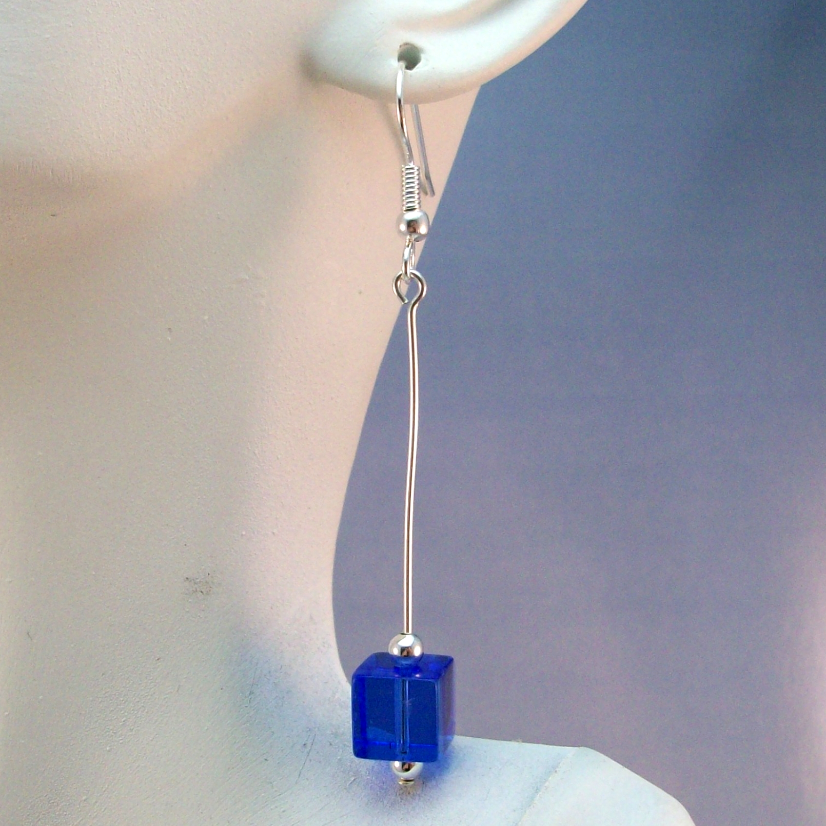 Cobalt Glass Cube Dangle Earrings – Handmade Jewelry with Hypoallergenic Earwires