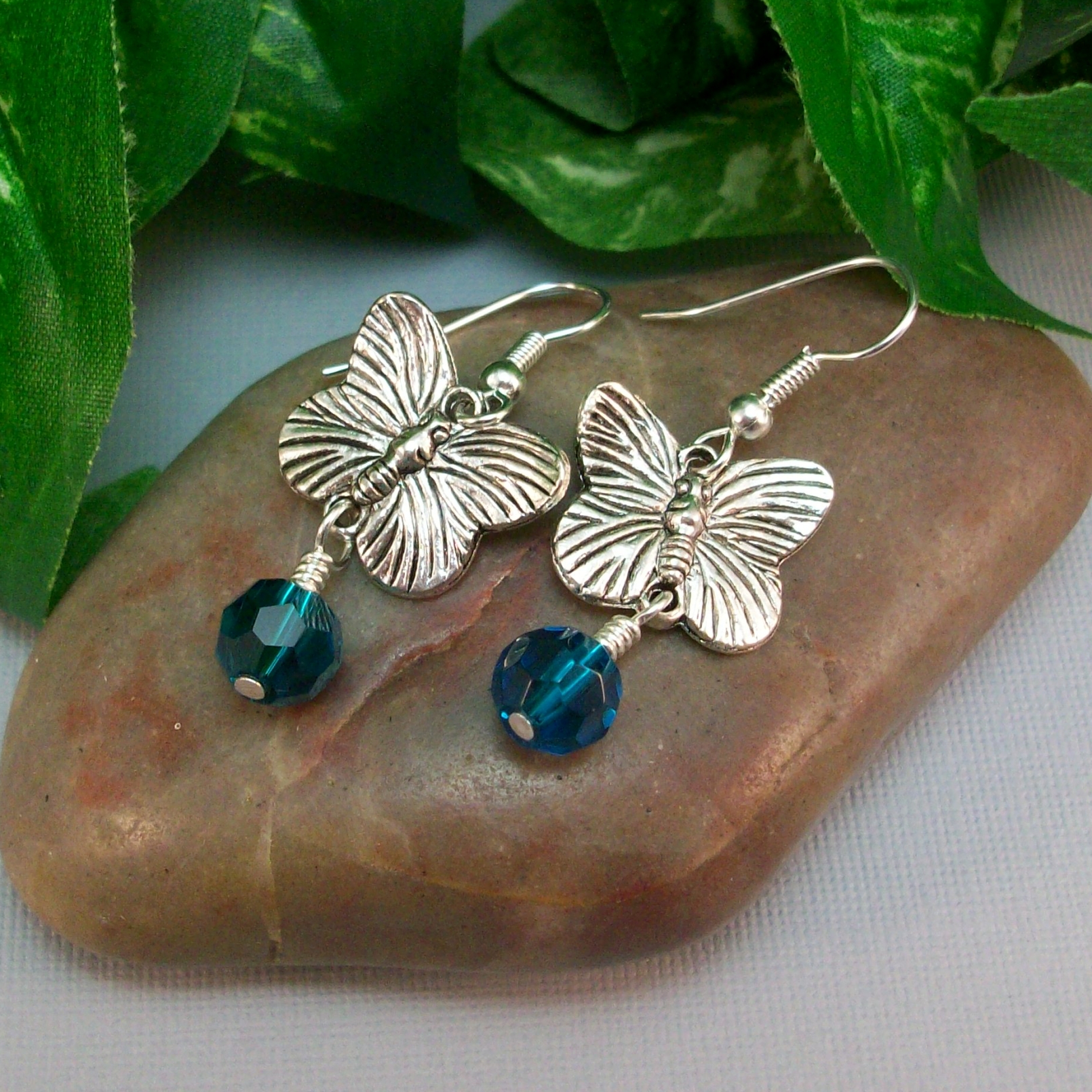 Let your style take flight with these handmade butterfly drop earrings, featuring antique silver plated charms paired with sparkling blue zircon crystals. Hung on hypoallergenic surgical steel earwires, they’re lightweight, comfortable, and perfect for everyday wear. Playful yet elegant, they bring a touch of whimsical magic to casual outfits or make a thoughtful gift for anyone who loves butterflies and shimmering gemstone sparkle. 18x14mm Antique Silver Plated Butterfly links and 8mm round Blue Zircon Crystals.