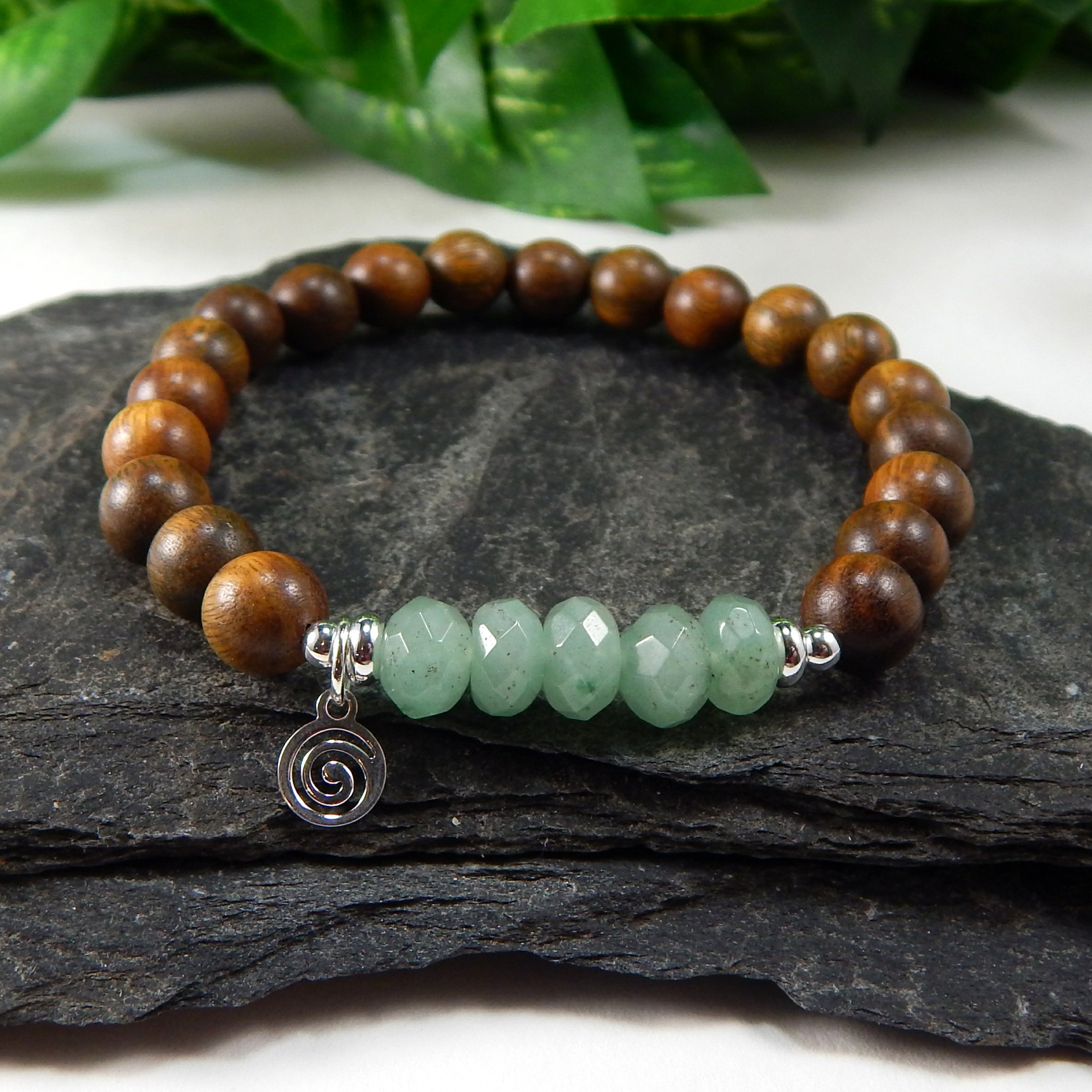 This handmade bracelet feels like a little charm of good fortune you can carry every day. The soft green glow of Aventurine is known for attracting luck, prosperity, and heart healing, while the warm Sandalwood beads bring grounding calm and a touch of sacred mindfulness. With its easy stretch design, it slips on effortlessly and becomes your everyday reminder to stay centered, welcome abundance, and let your quiet magic flow with ease. 8mm Sandalwood round and faceted Green Aventurine rondelle beads, accented with silver spacer beads and a silver swirl charm.