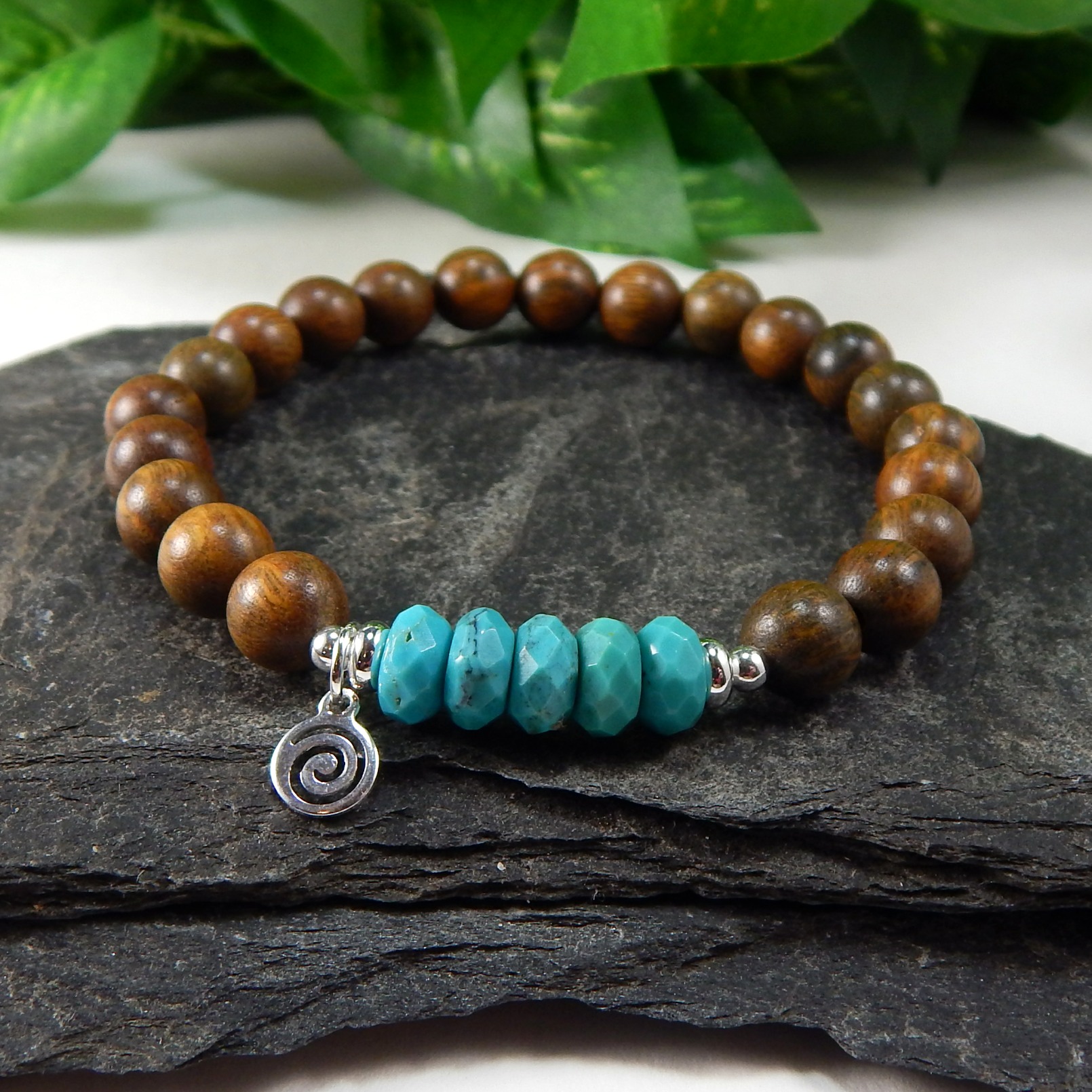 This bracelet feels like a gentle breath of serenity you can carry with you. The soothing blue of Turquoise is known for protection, clarity, and emotional healing, while the warm, grounding energy of Sandalwood adds mindfulness and a touch of sacred calm. With its easy stretch design, it slips on effortlessly and becomes your everyday reminder to stay centered, embrace peace, and let your quiet magic flow. 8mm Sandalwood round and faceted Turquoise rondelle beads, accented with silver spacer beads and a silver swirl charm.