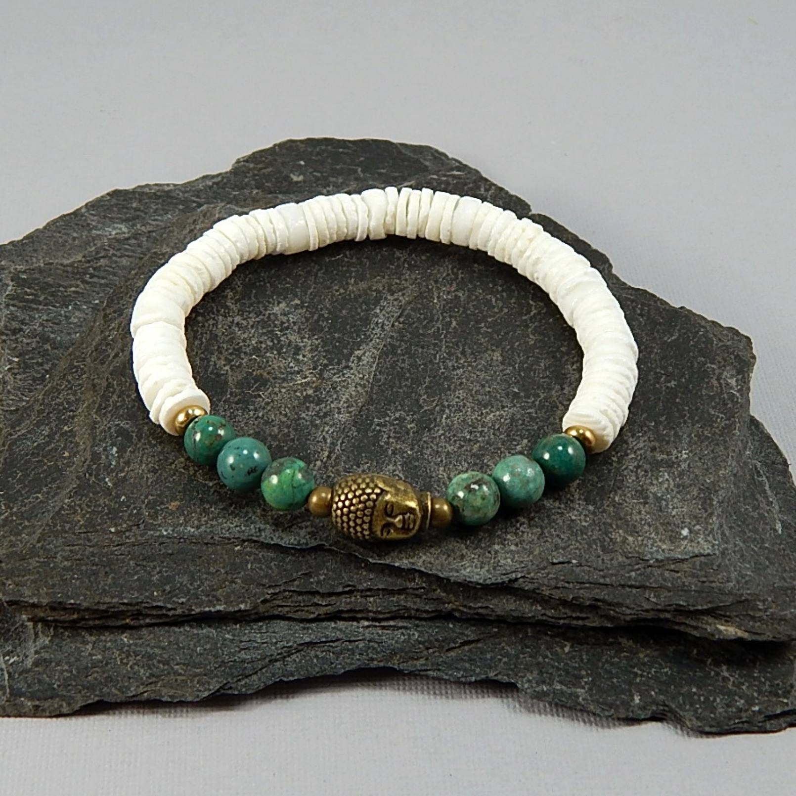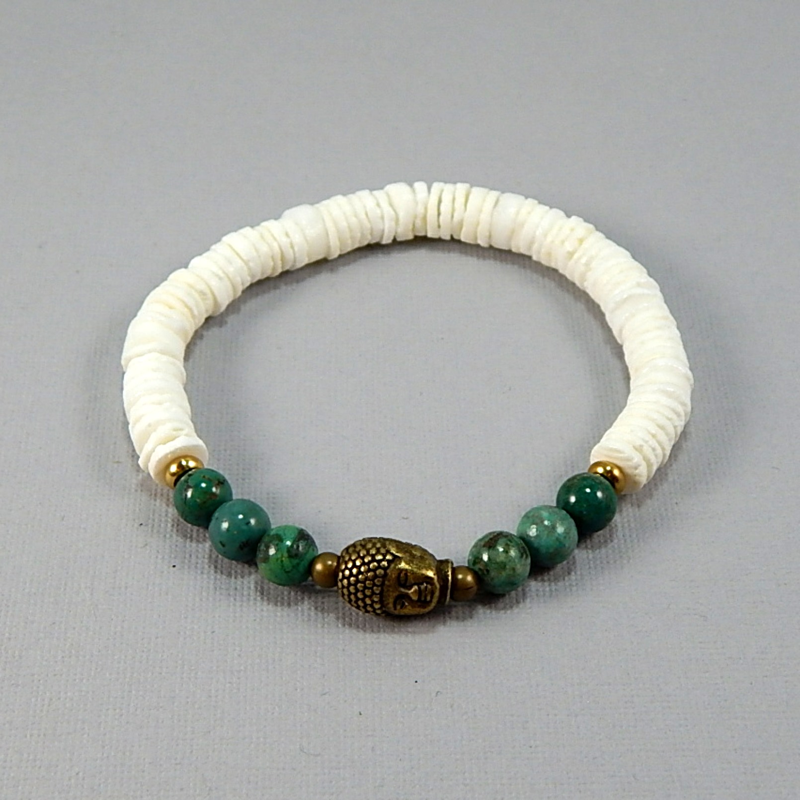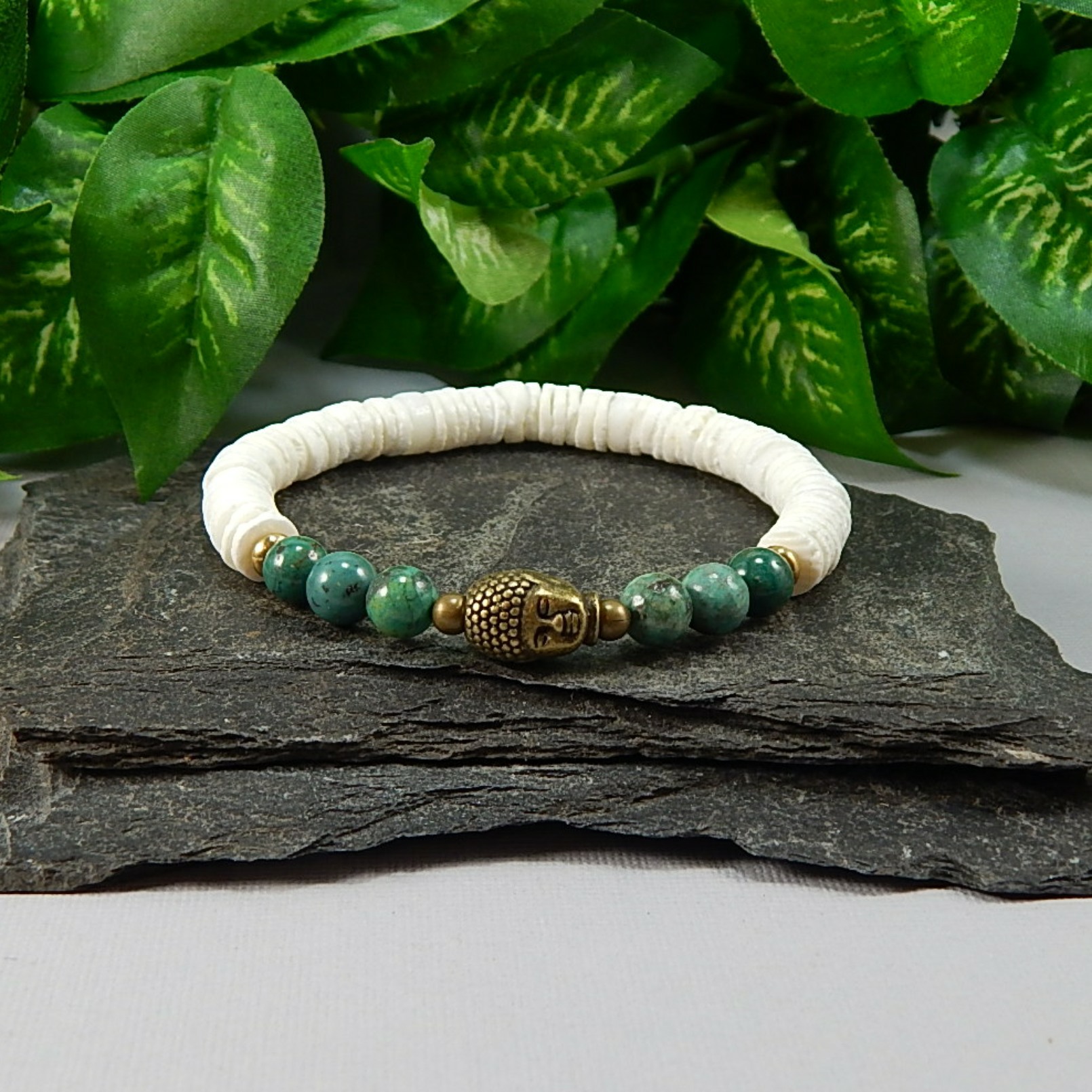 Turquoise & Puka Shell Bracelet with Brass Buddha – Peace, Protection & Ocean Spirit