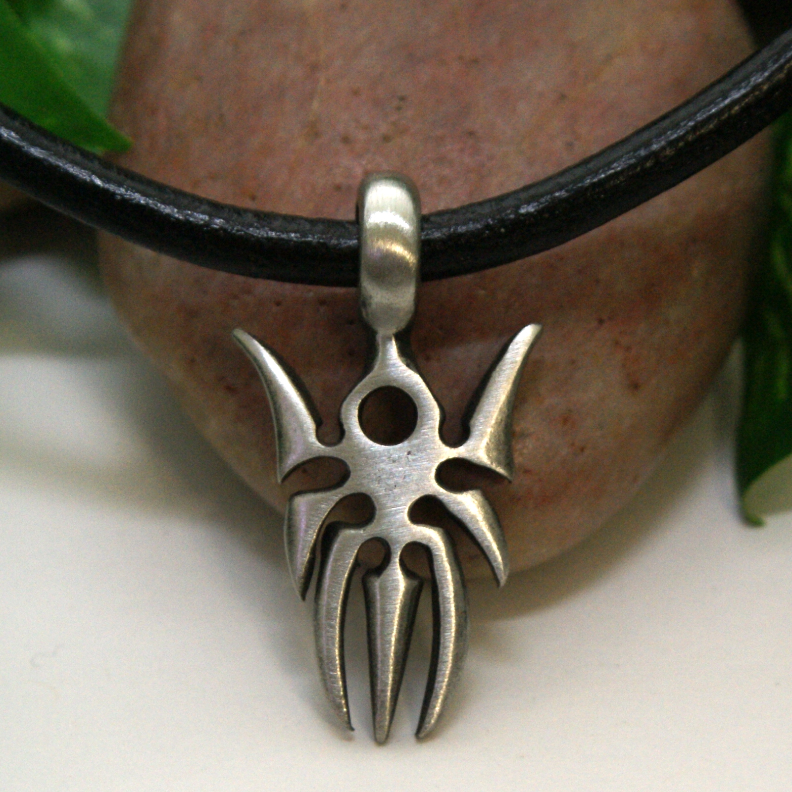 The pendant is a 39x21mm (approx. 1.5x.8in) antique silver pewter Spider on 5mm Greek leather cord.